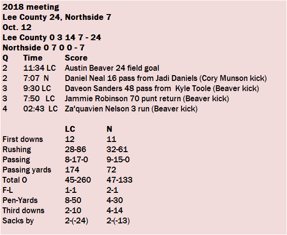 Northside led Lee County 7-3 at halftime in their first meeting, and watched the Trojans put up 14 points in less than two minutes in the third quarter for a 24-7 win back on Oct. 12.