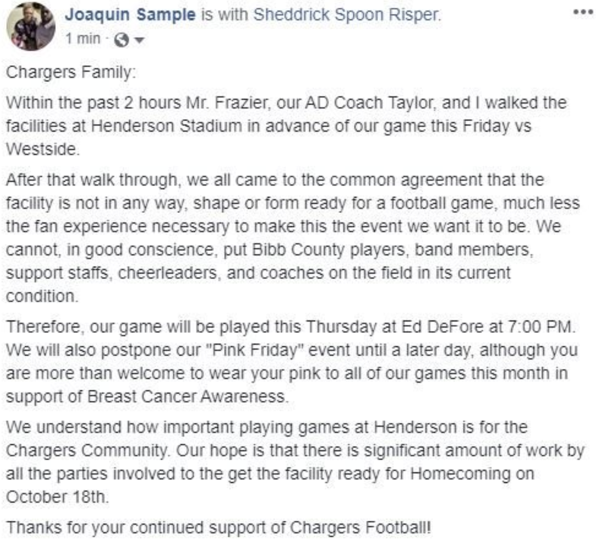 Central head coach Joaquin Sample, Westside head coach Spoon Risper, and Central athletics director Andre Taylor and principal Emanuel Frazier walked the facility Tuesday morning and decided it wasn’t yet playable.