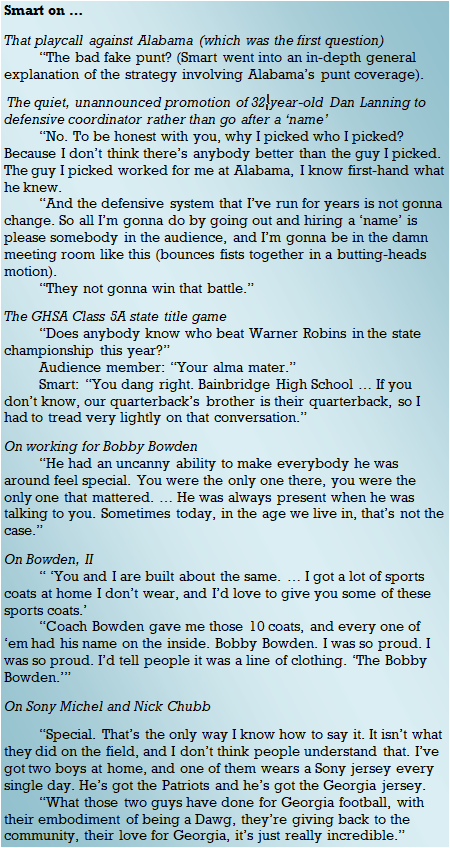 “I said, ‘you guys are going to miss this,’” Smart said Monday night as the featured speaker at The Macon Touchdown Club’s year-end jamboree. “I said, ‘Every guy that came back to Alabama after they left, they missed it. You’re going to be in the NFL, and you’re going to be there for awhile, but you’re going to miss this.’ ”