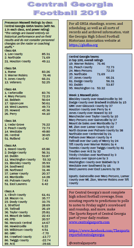 Central Georgia Sports ReportAugust 29, 2019Comment More preseason Central Georgia high school football: Maxwell Ratings, each class, CGA teams in state top 100, first-week Maxwell predictions Central Georgia Sports ReportAugust 29, 2019Comment Links: Georgia HS Football Historians AssociationThe Sports Report of Central GeorgiaThe Sports Report on Facebook Central Georgia Sports Report Facebook0 Twitter 0 Likes