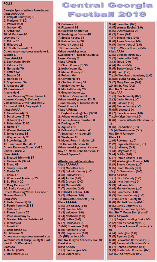 Central Georgia Sports ReportAugust 30, 2019Comment HSFB2019: The latest GSWA and AJC polls, and Maxwell predictions Central Georgia Sports ReportAugust 30, 2019Comment Central Georgia Sports Report Facebook0 Twitter 0 Likes