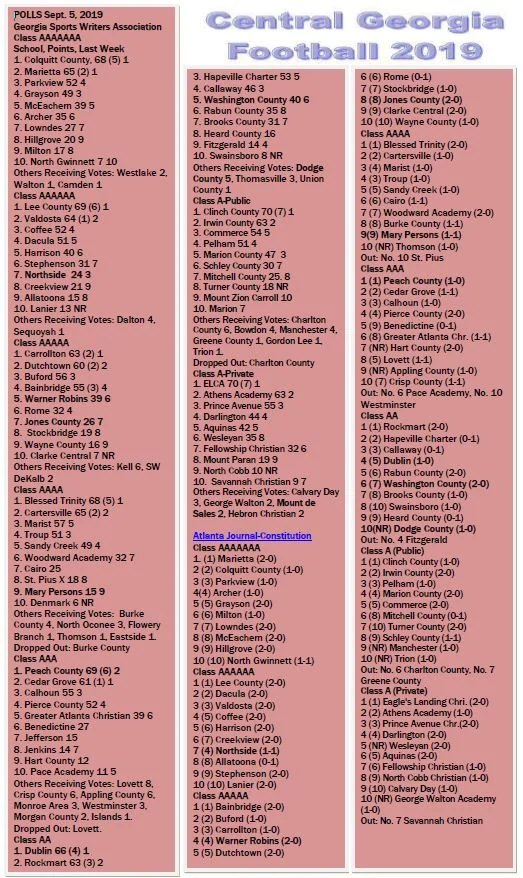 Central Georgia Sports ReportSeptember 05, 2019Comment HSFB 2019: The latest GSWA and AJC polls, and Maxwell predictions Central Georgia Sports ReportSeptember 05, 2019Comment Central Georgia Sports Report Facebook0 Twitter 0 Likes