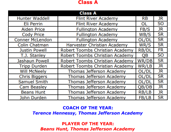 The GIAA didnโt separate for offense, defense, and special teams, nor for first or second teams and honorable mentions, and no positions were listed for Class 4A.