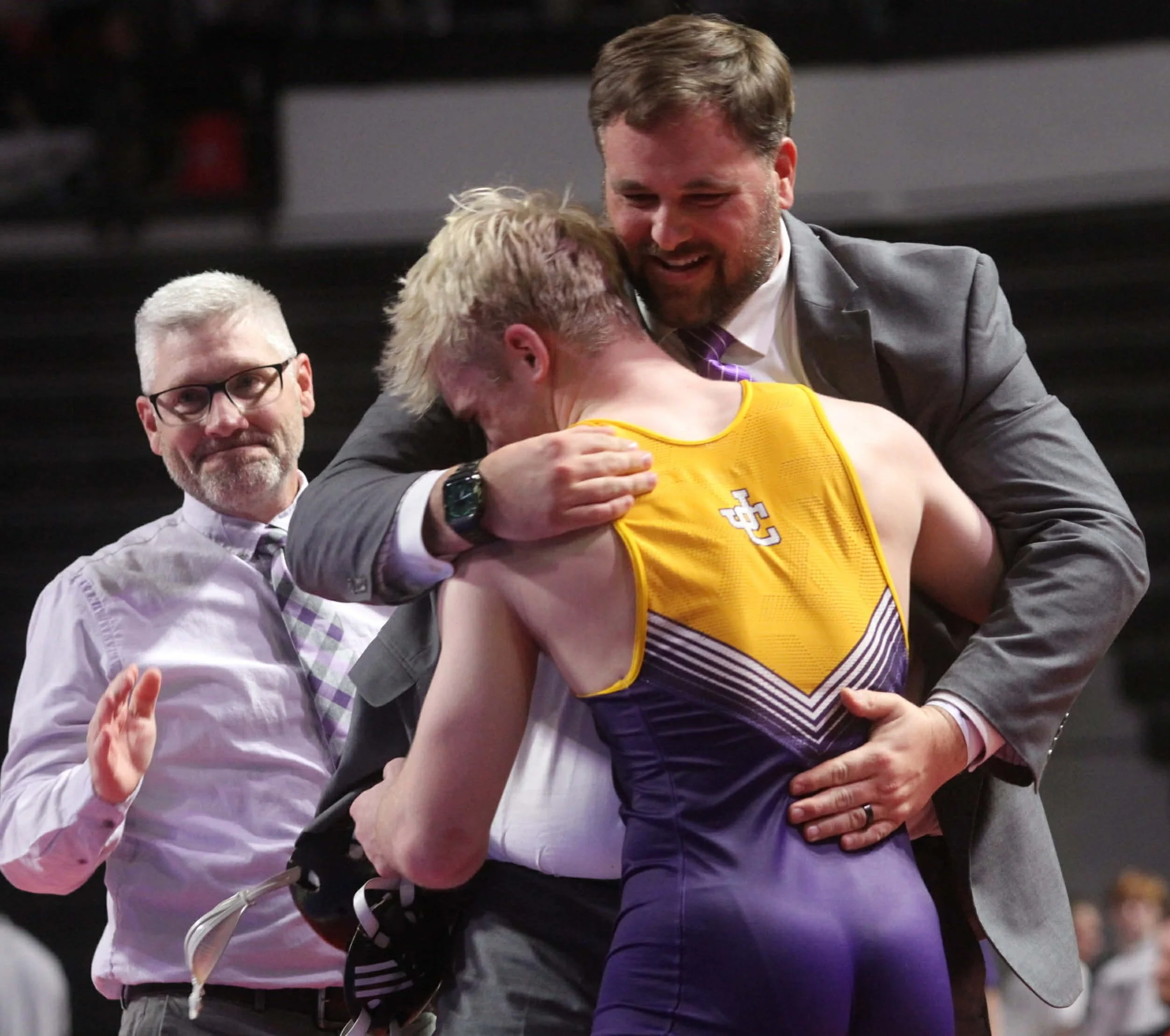 Jones County head coach Adam Gillhouse hugs state champ Arrie Martin as assistant coach Tony Monroe applauds.