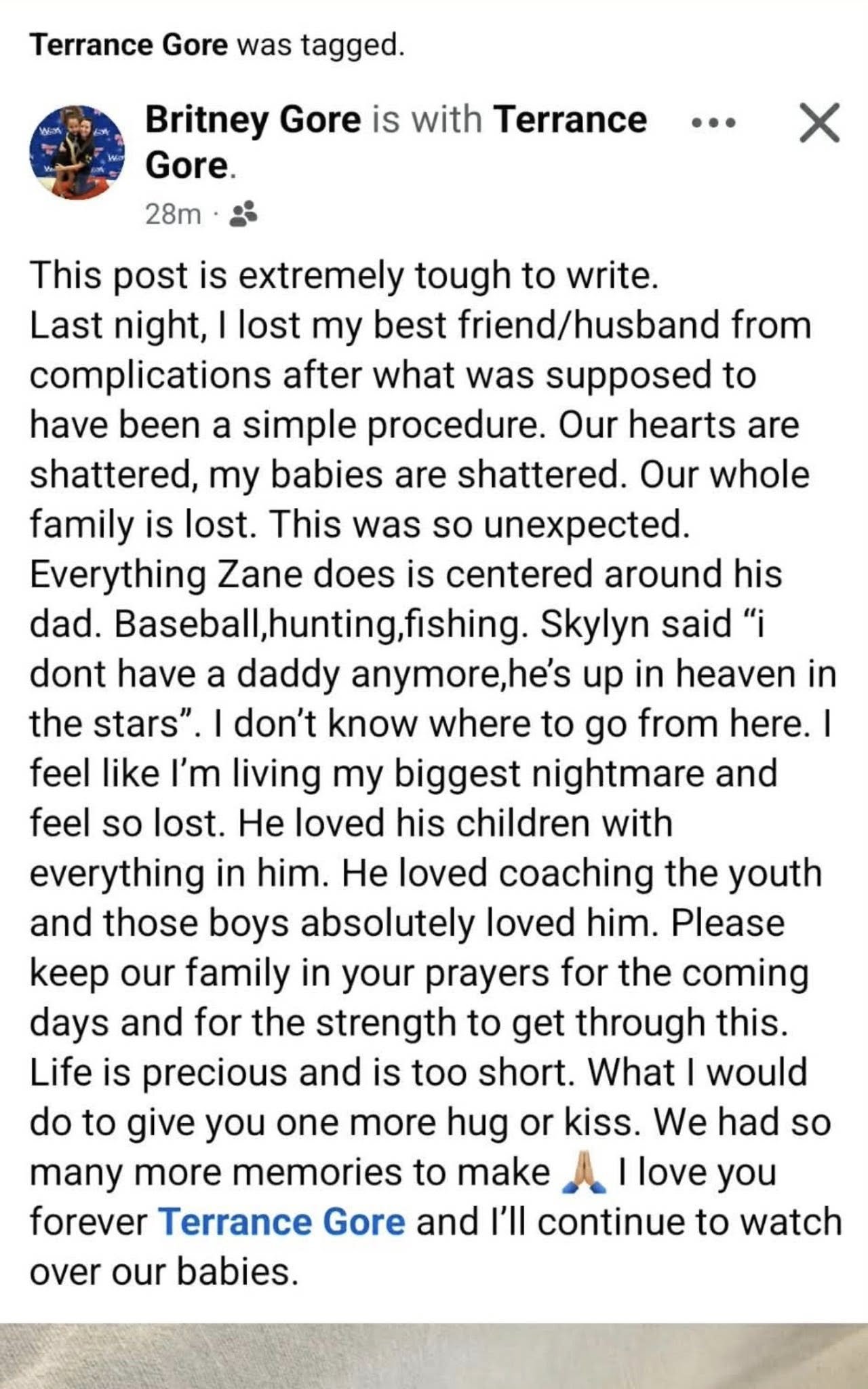 From Bay County Youth Athletics: βIt is with heavy hearts that BCYA mourns the loss of Terrance Gore. Terrance was more than a baseball player β he was a true community pillar who lived the game, inspired others, and left a lasting impact both on and off the field.β