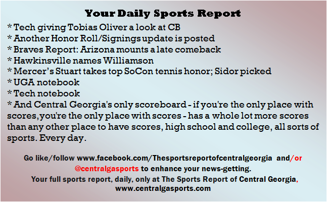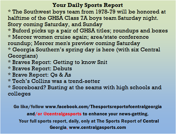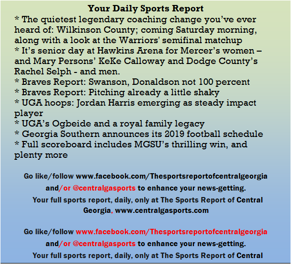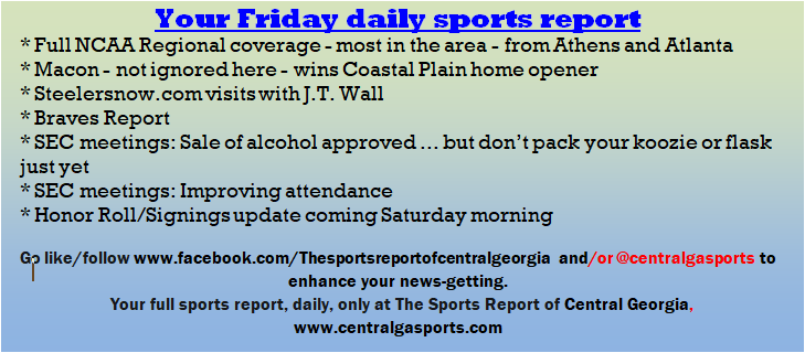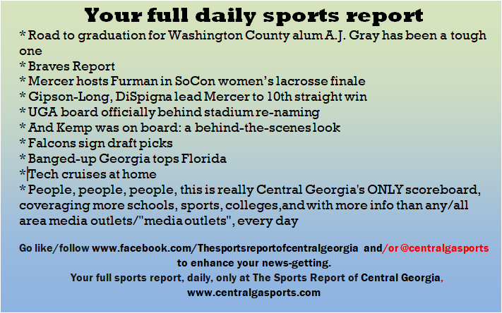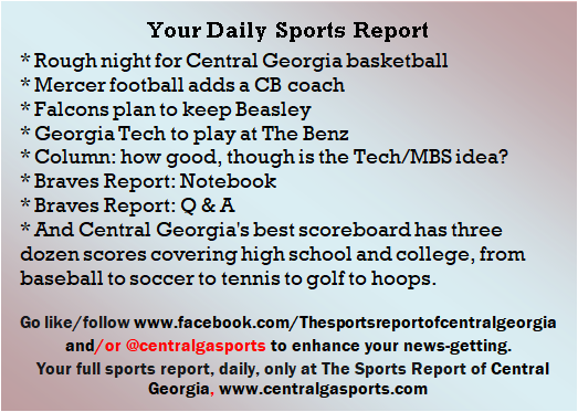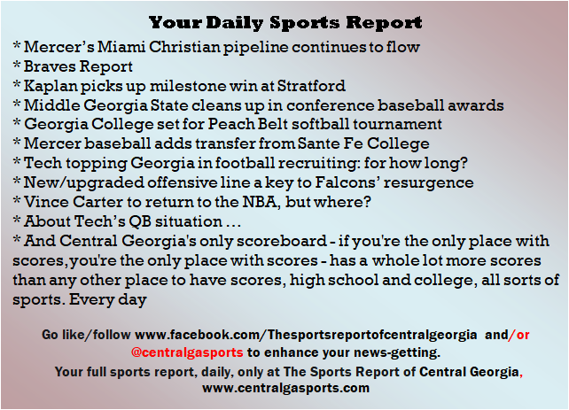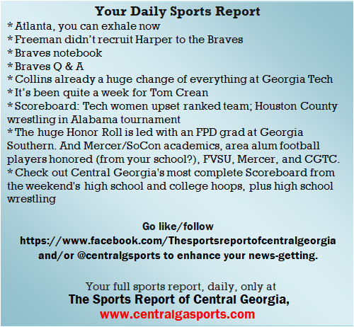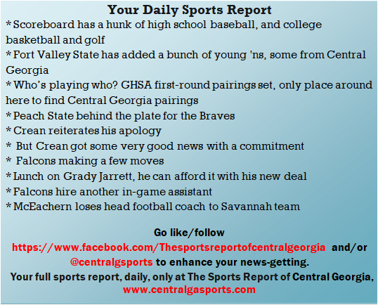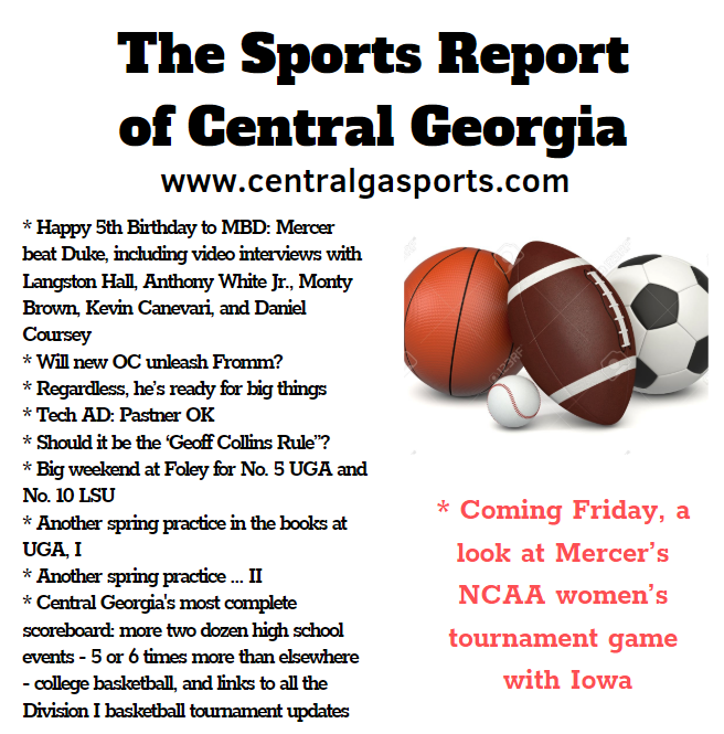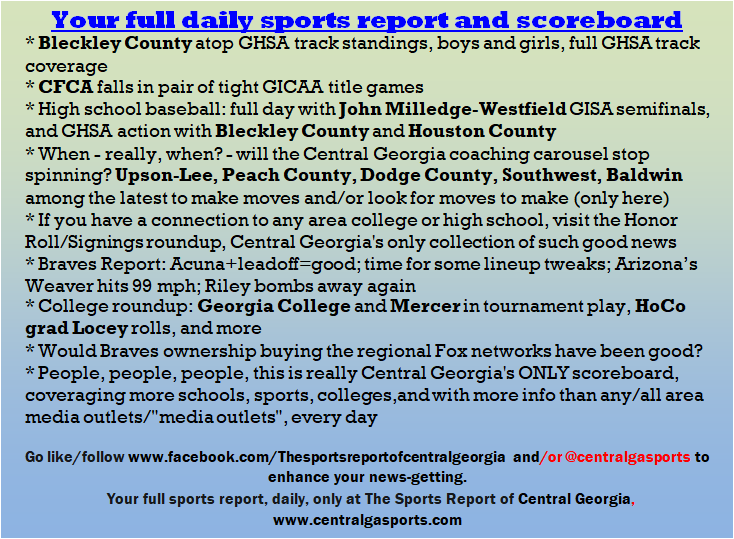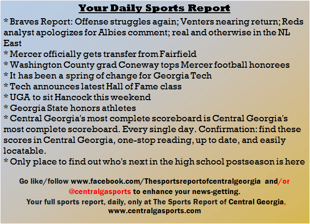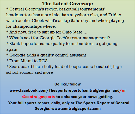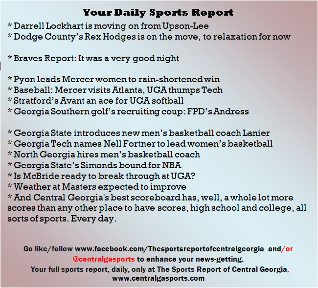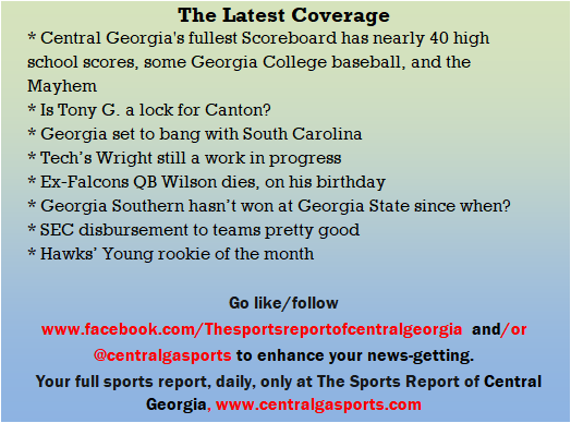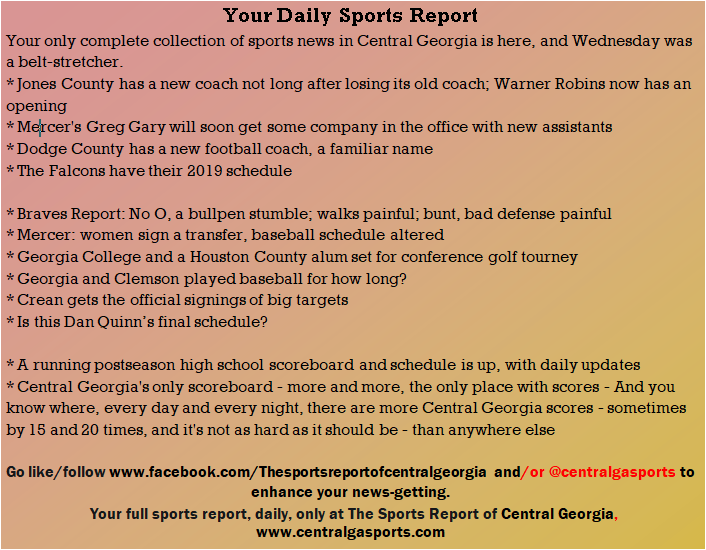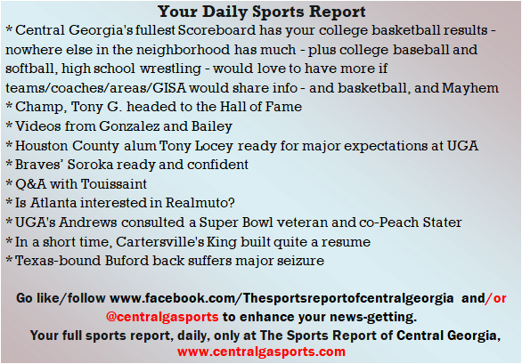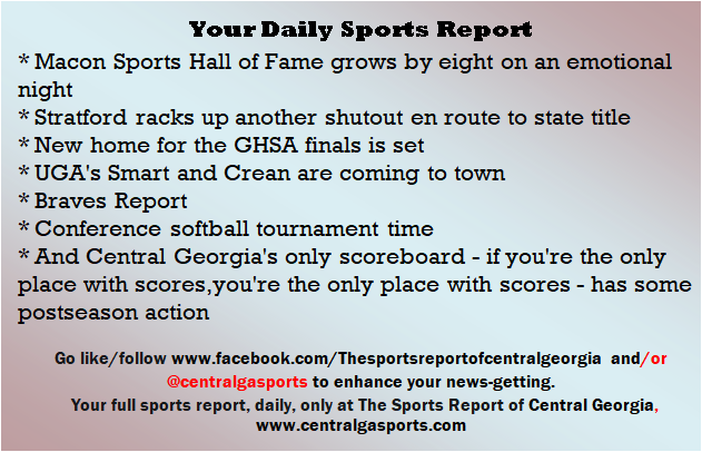 Each morning, go to The Latest Coverage, and check it out mid-afternoon and in the evening. And to keep up with what's going on and what's coming to The Sports Report, follow @centralgasports and https://www.facebook.com/Thesportsreportofcentralgeorgia, where you'll find more relevant and notable postings and updates, in Central Georgia and beyond.