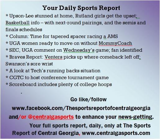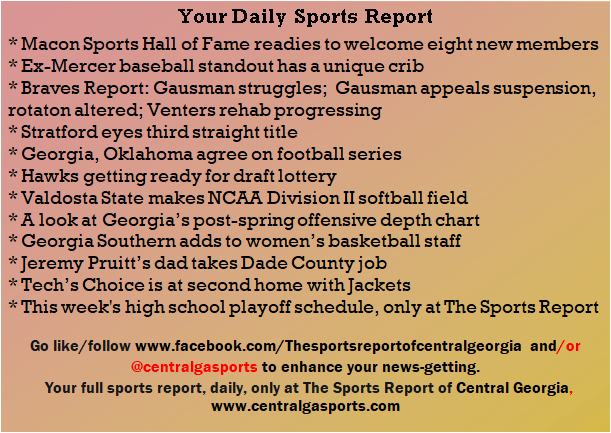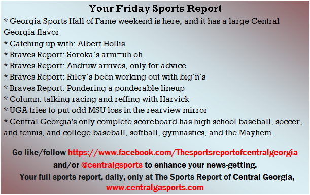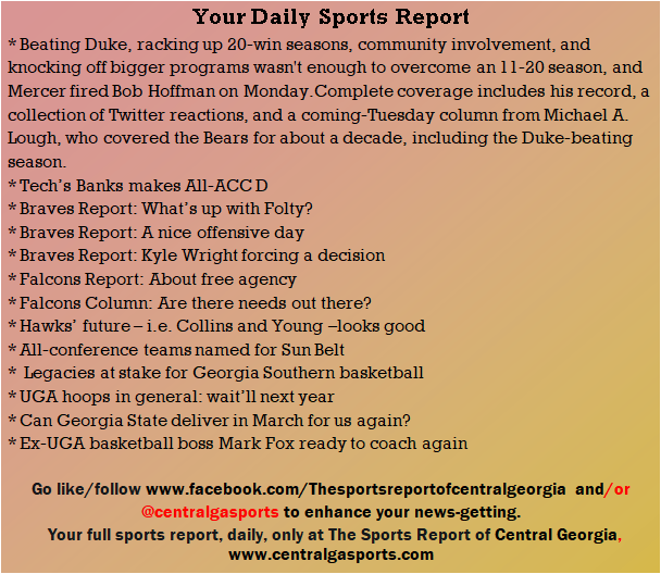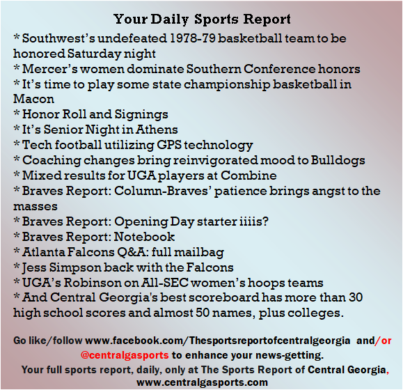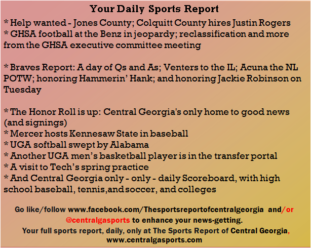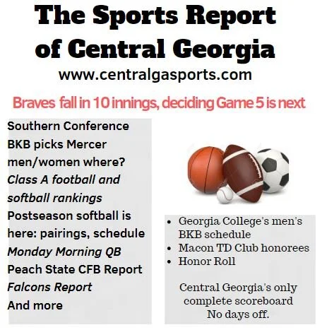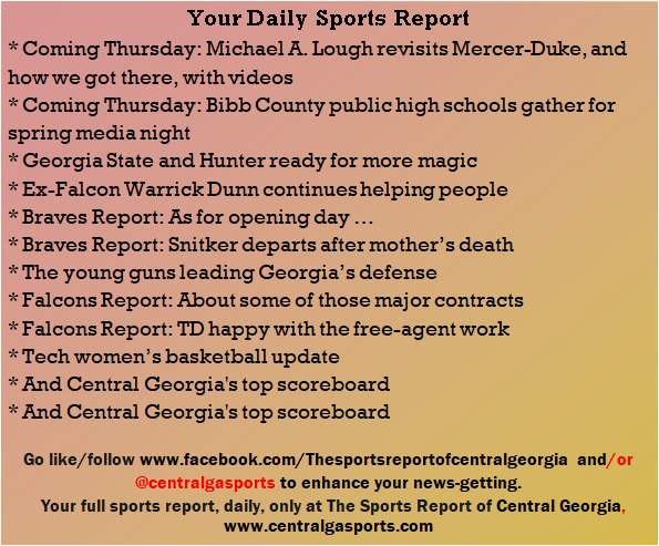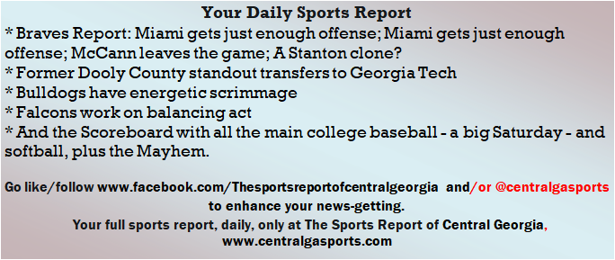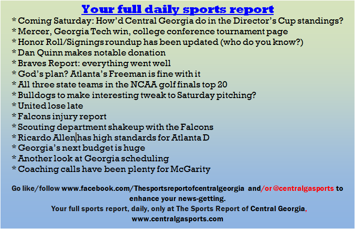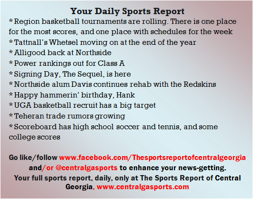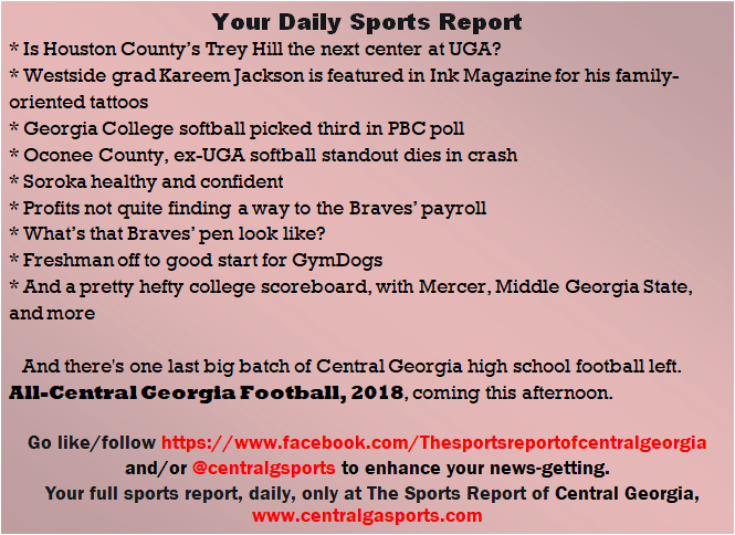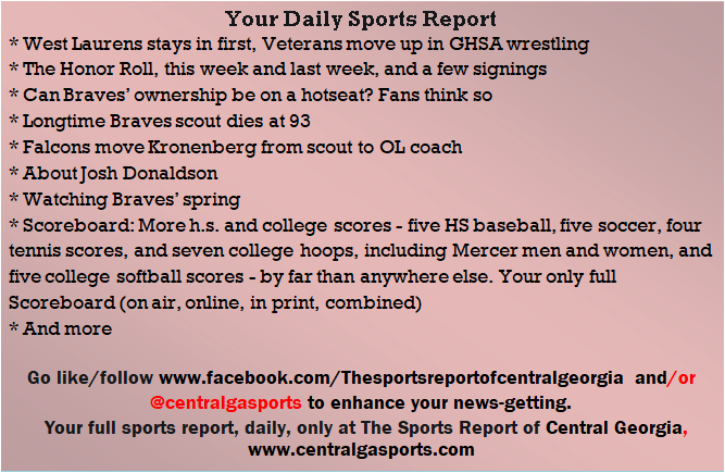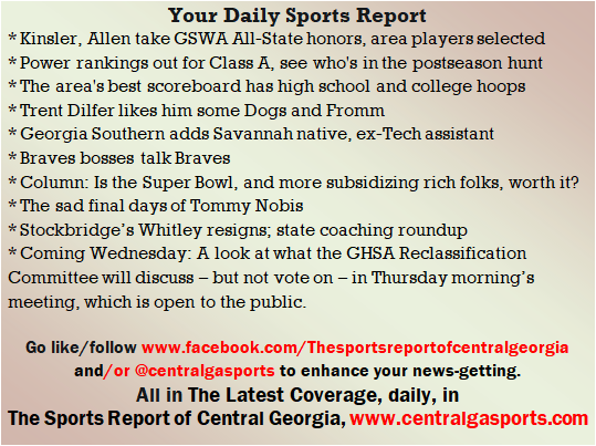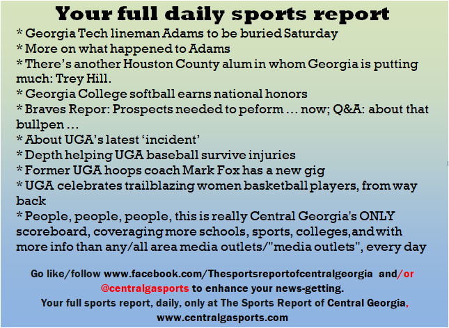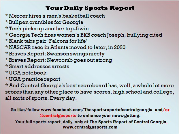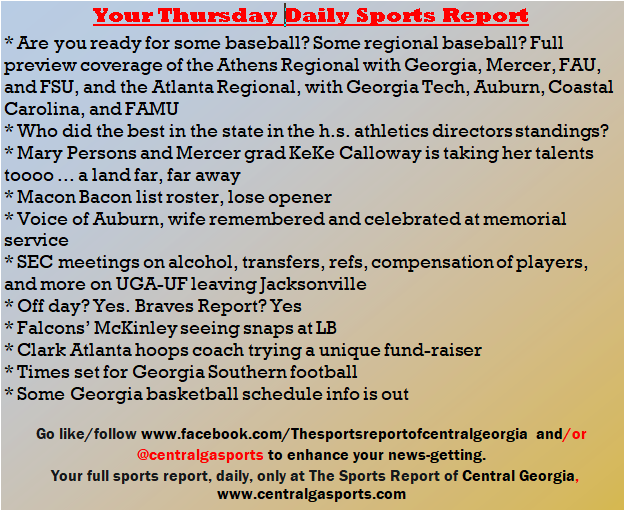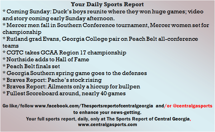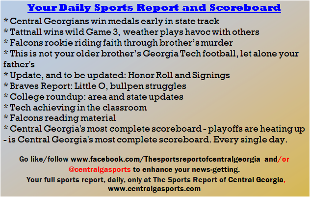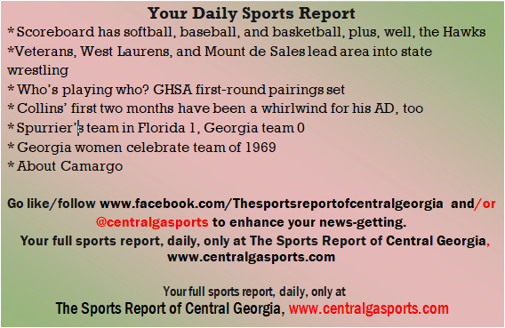 Each morning, go to The Latest Coverage, and check it out mid-afternoon and in the evening. And to keep up with what's going on and what's coming to The Sports Report, follow @centralgasports and https://www.facebook.com/Thesportsreportofcentralgeorgia, where you'll find more relevant and notable postings and updates, in Central Georgia and beyond.