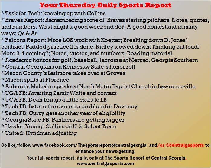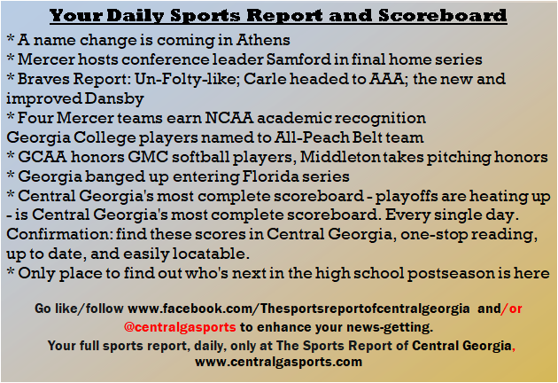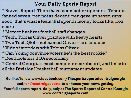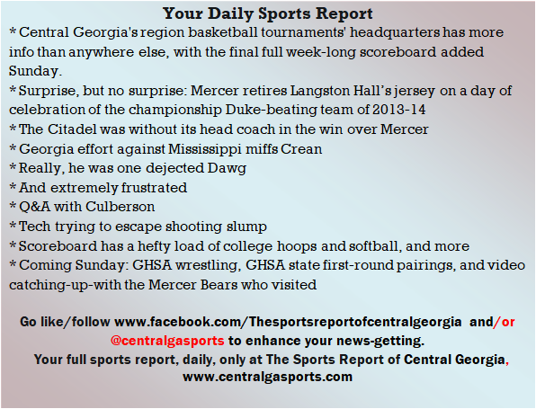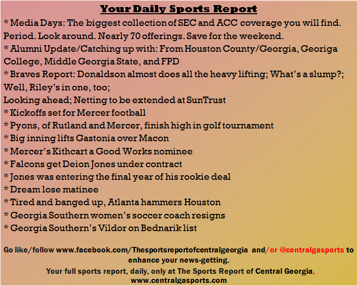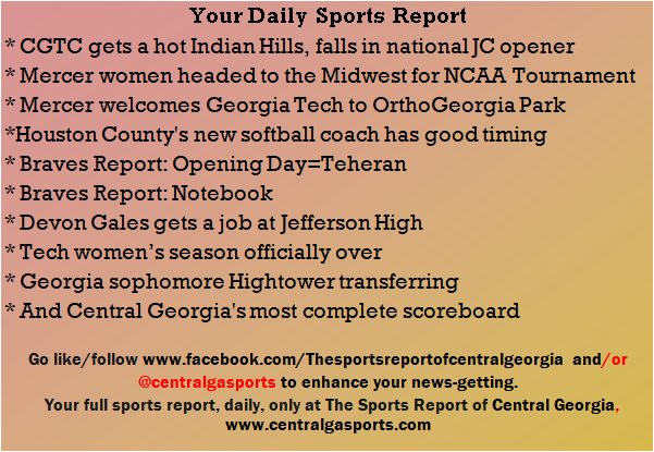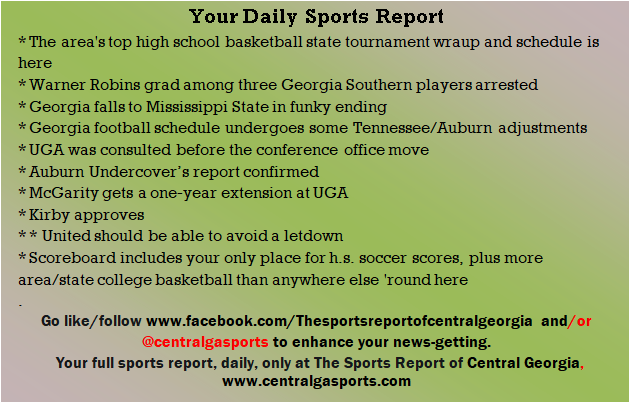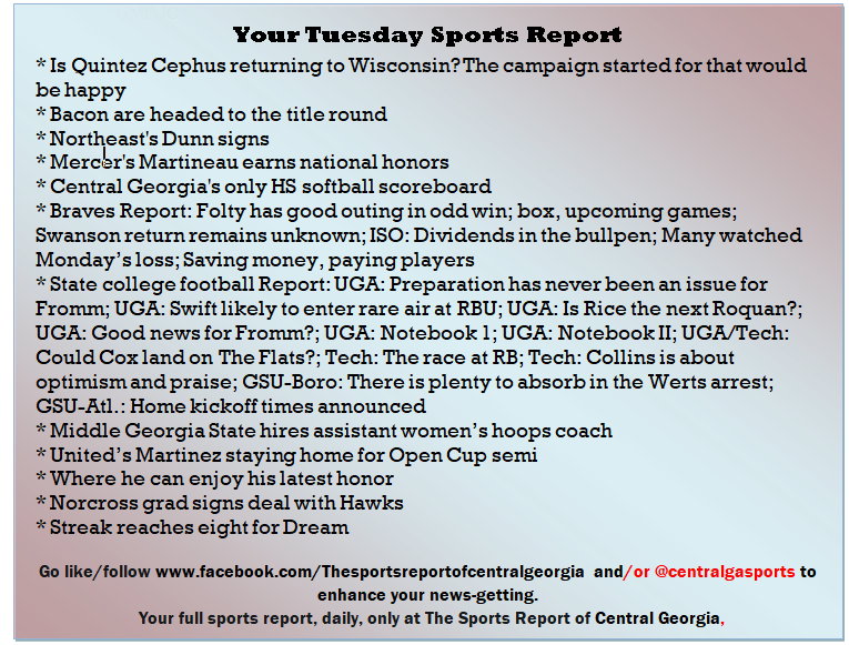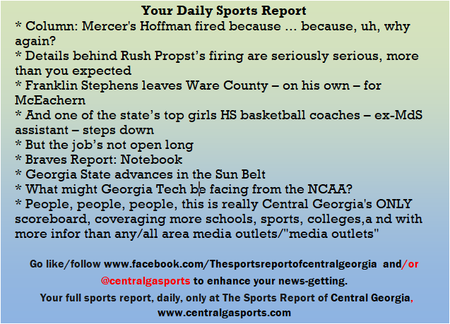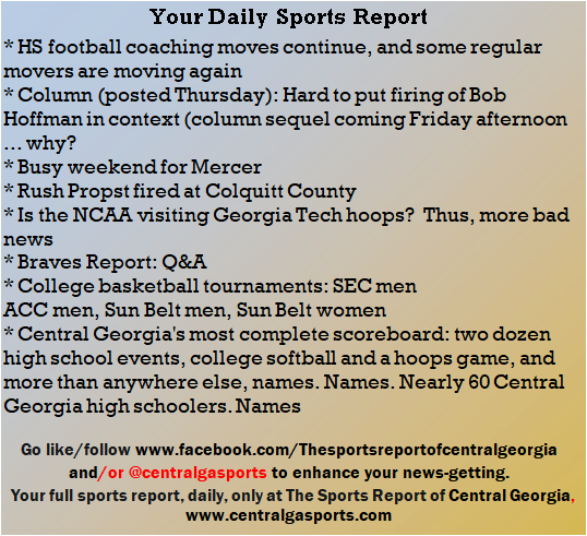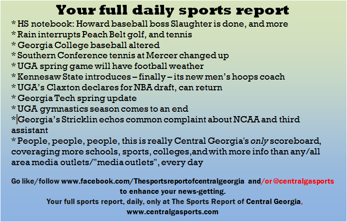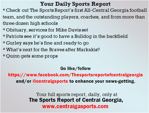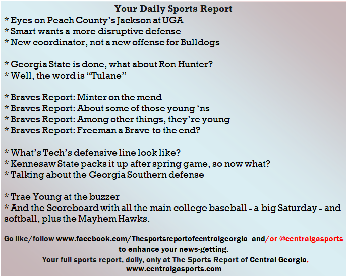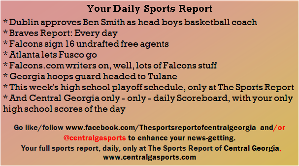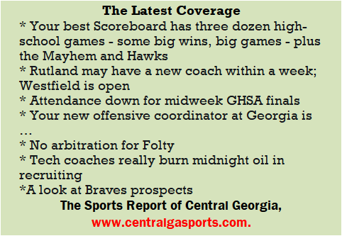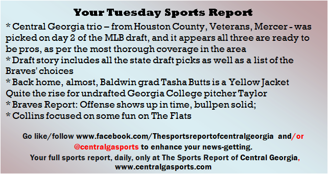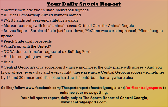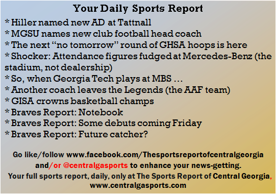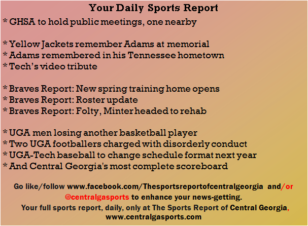 Each morning, go to The Latest Coverage, and check it out mid-afternoon and in the evening. And to keep up with what's going on and what's coming to The Sports Report, follow @centralgasports and https://www.facebook.com/Thesportsreportofcentralgeorgia, where you'll find more relevant and notable postings and updates, in Central Georgia and beyond.