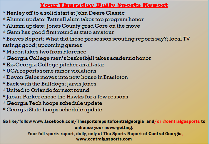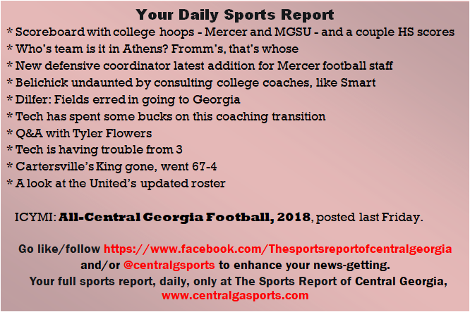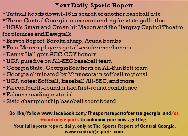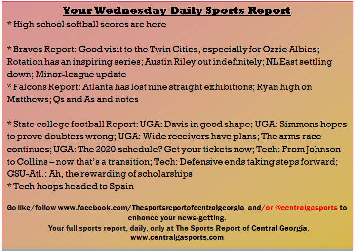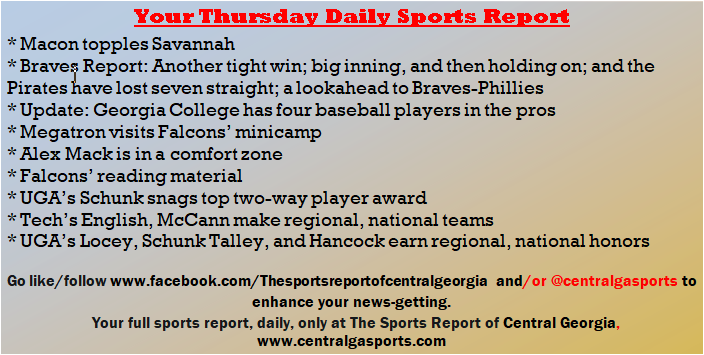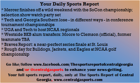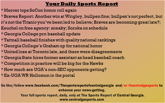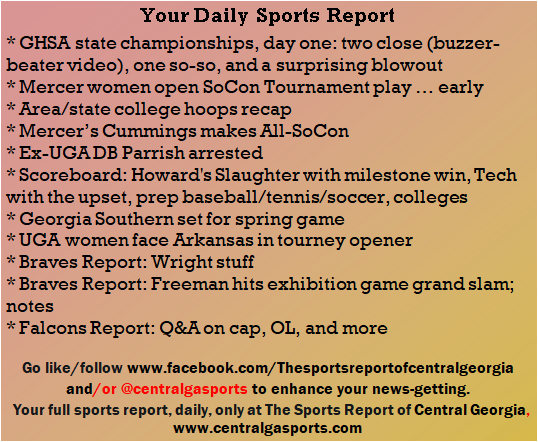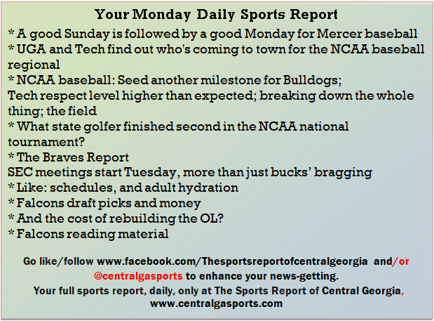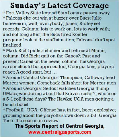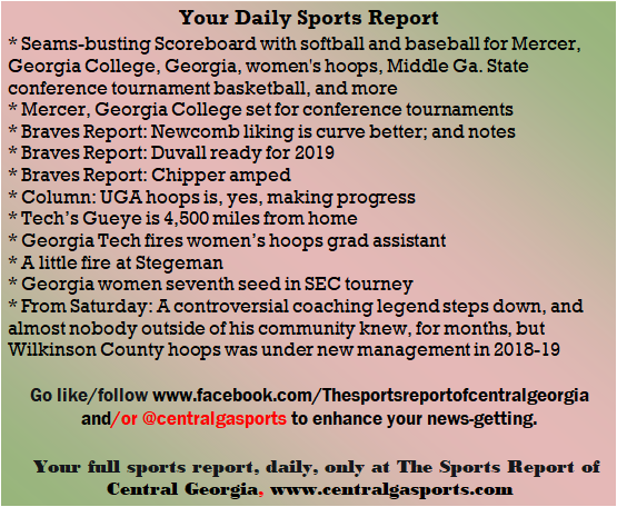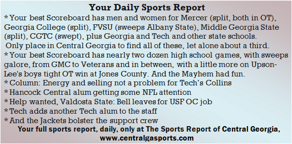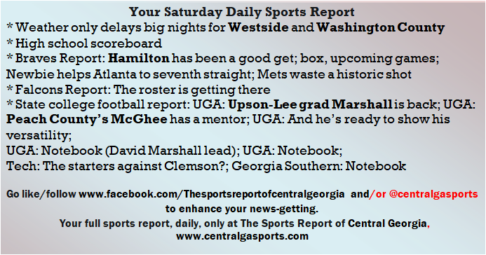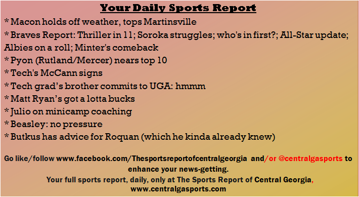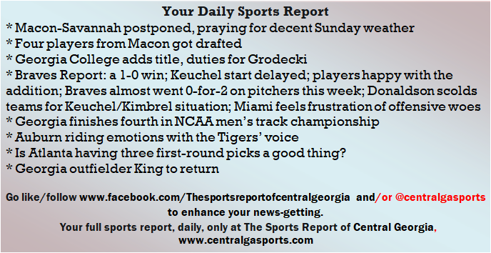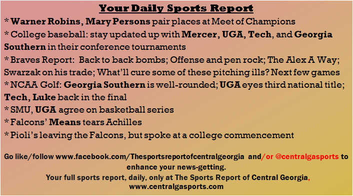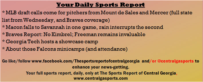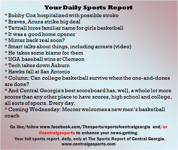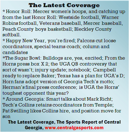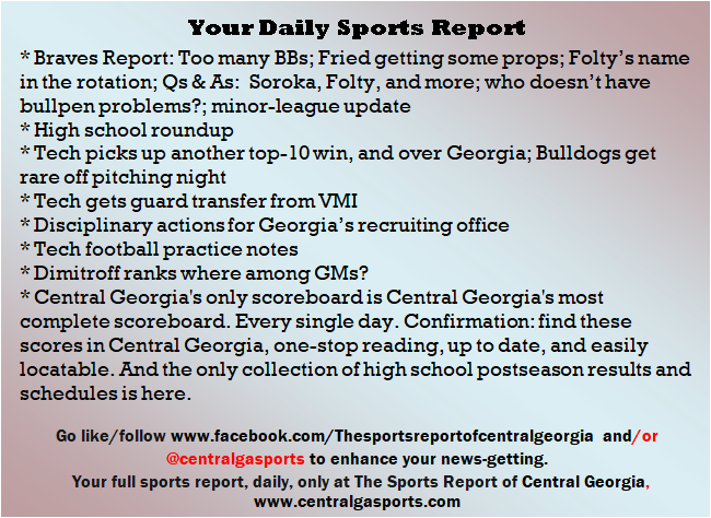 Each morning, go to The Latest Coverage, and check it out mid-afternoon and in the evening. And to keep up with what's going on and what's coming to The Sports Report, follow @centralgasports and https://www.facebook.com/Thesportsreportofcentralgeorgia, where you'll find more relevant and notable postings and updates, in Central Georgia and beyond.