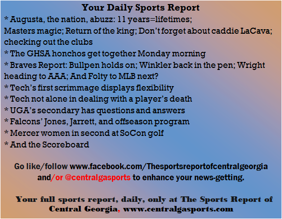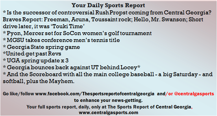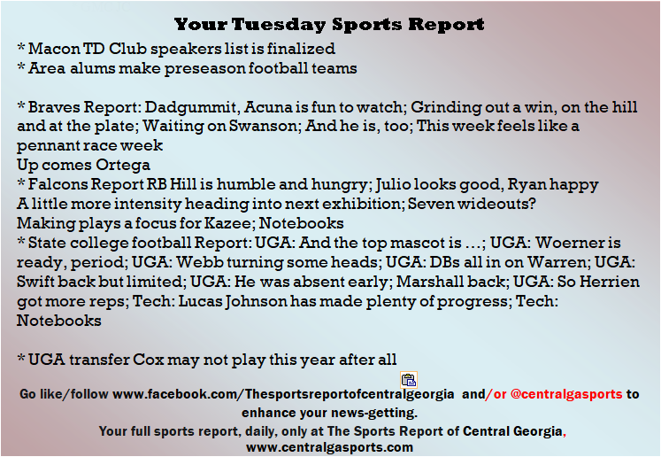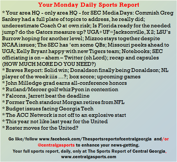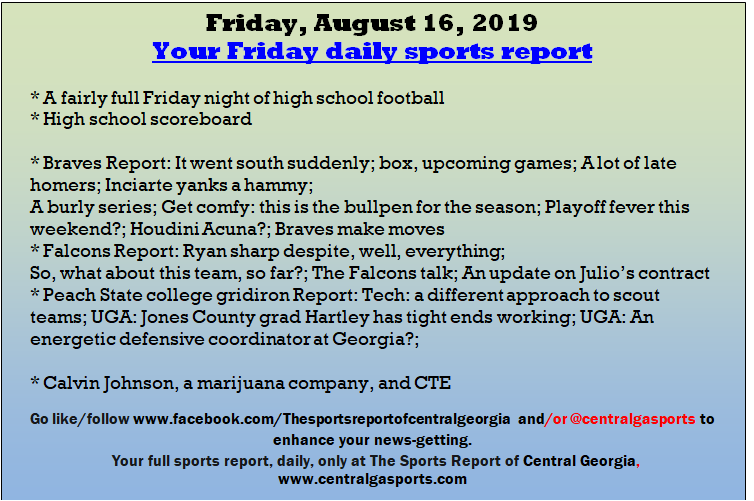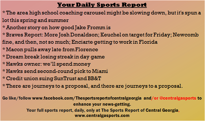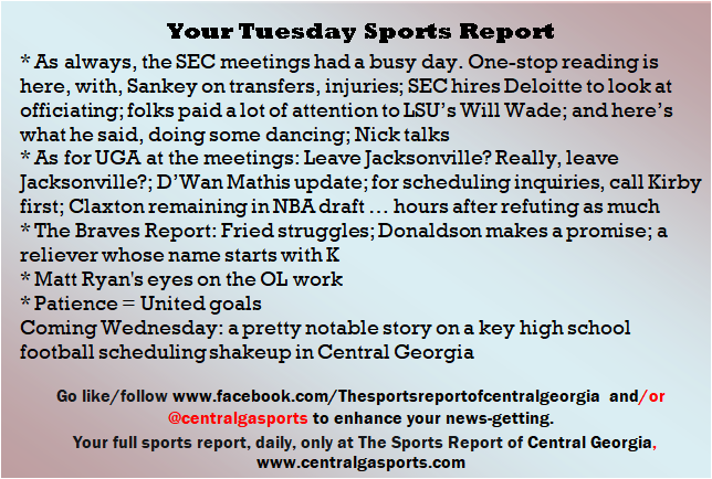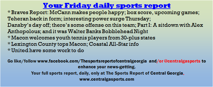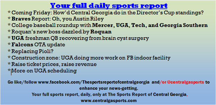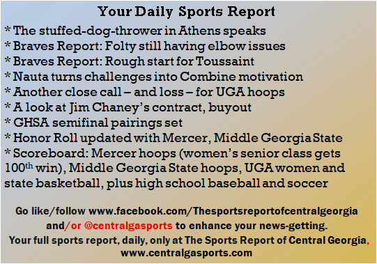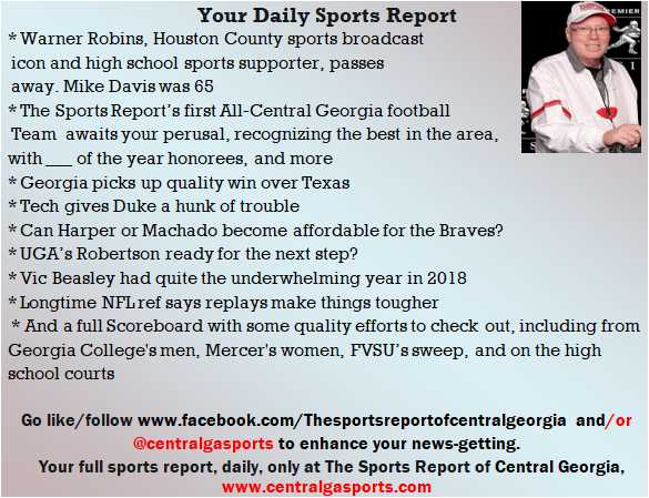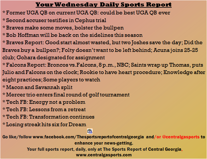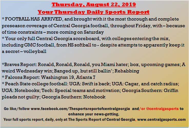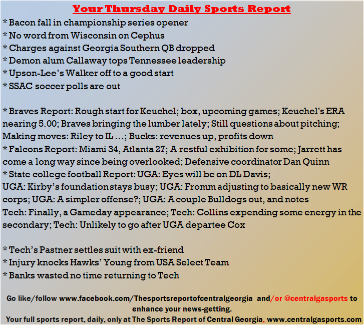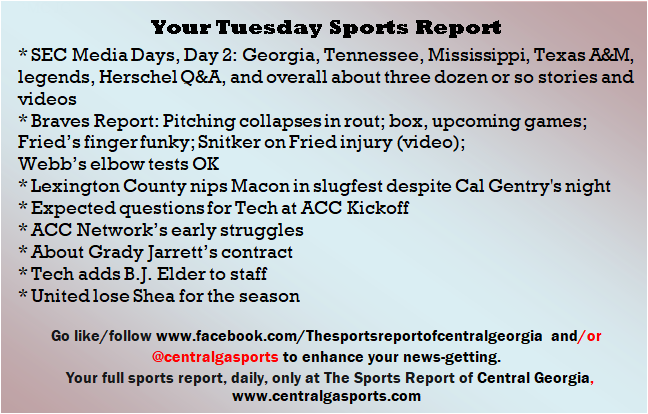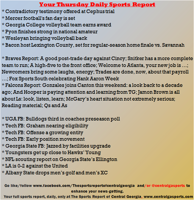 Each morning, go to The Latest Coverage, and check it out mid-afternoon and in the evening. And to keep up with what's going on and what's coming to The Sports Report, follow @centralgasports and https://www.facebook.com/Thesportsreportofcentralgeorgia, where you'll find more relevant and notable postings and updates, in Central Georgia and beyond.
